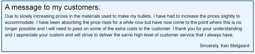 Bullet Information CopperHead Bullets are currently available in the following 6mm, .22 cal and .30 cal configurations. 6.5mm, 7mm and .30 Cal VLD bullets coming depending on demand. Email Ken if you would be interested in these new products. The bullets are not normally moly coated but if required, moly coating is available at an extra cost of $25 per 1000. Minimum order for moly coated bullets is 1000 (1200 for .22cal). Please specify moly coating when ordering. Sample Bullets Request Packs of 25 sample bullets for each bullet are available for $25 including postage. The $25 will be fully refunded on your first order. Order a Sample Pack if you would like to test these great bullets. Bullet Types20 Cal.100 & 300 per box